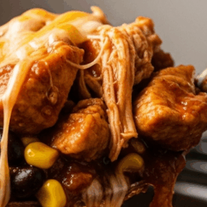 slow-cooked with enchilada sauce, beans, corn, and spices, then topped with gooey melted cheese.