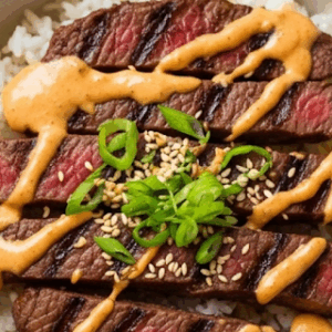 Korean BBQ Steak Rice Bowls are a mouthwatering combination of tender, juicy steak served over fluffy rice and topped with a bold, spicy cream sauce. This dish brings together the rich flavors of Korean barbecue with the comforting satisfaction of a rice bowl, making it perfect for lunch, dinner, or even a hearty weekend meal. The steak is marinated to perfection, grilled or seared until slightly charred on the outside and tender inside, then layered over warm rice that soaks up every drop of flavor.